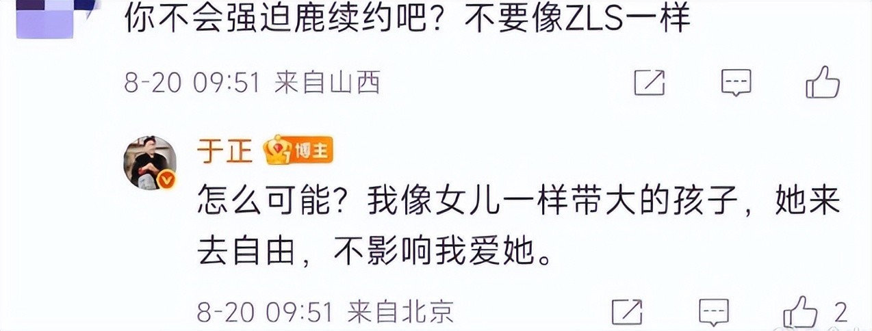 现在网友们都在关注,白鹿会不会续约,在讨论的时候,“于正说不会强迫白鹿续约”话题登上热搜,因为有网友跑到于正社交账号下留言:他会不会强迫白鹿续约?而于正立即进行回复:怎么可能,我像女儿一样带大的孩子,她来去自如,不影响我爱她。